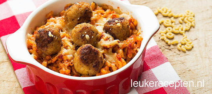 Macaronischotel uit de oven met courgette, champignons en licht pittige kipballetjes